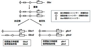 [[ファイル:Yamasu Gbx family Fig3.jpg|サムネイル|'''図3.DDCモデルによって説明される脊椎動物のGbx遺伝子の転写制御機構の分子進化(仮説)'''<br>祖先Gbx遺伝子は、少なくとも3種の独立したエンハンサーによって制御されている。第1のエンハンサーは原腸形成期において後方神経板での転写を活性化し(長方形)、第2のエンハンサーは原腸形成終了後において後脳前端での発現を誘導し(円)、第3のエンハンサーはr1を除く後脳などGbx1特有の発現を制御する (楕円)。推定エンハンサーの位置は任意に示している。脊椎動物の進化初期での遺伝子重複後、四足類の場合、初期神経板後方エンハンサーと後期後脳エンハンサーはGbx1で消失したが、Gbx2では保持された。一方、真骨魚系統のgbx1およびgbx2では相補的な形で保持されている。 四足類のGbx1がゲノムから排除されなかったのは、第3エンハンサーによって発現が駆動される領域において、この遺伝子が不可欠な役割を果たしているためと考えられる。結果的に、共通祖先でのGbxの発現は、無脊椎動物、脊椎動物各々について、Gbx1、Gbx2のいずれかが担うことになり、2種のGbxの間で機能的なシャッフリングが起きたと推定される。]] | |||