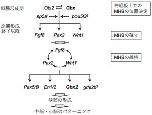 [[ファイル:Yamasu Gbx family Fig2.jpg|サムネイル|'''図2.峡部オーガナイザーの形成に関わる遺伝子カスケード'''<br>主としてマウス、ニワトリ、ゼブラフィッシュでの研究から推定された。原腸形成期ではたらくGbxは四足類ではGbx2、ゼブラフィッシュではgbx1と考えられる。出典は本文参照。ただし、1–3のゼブラフィッシュ遺伝子については文献<ref name=Belting2001><pubmed>11709144</pubmed></ref><ref name=Burgess2002><pubmed>11861474</pubmed></ref><ref name=Tallafuß2001><pubmed>11641225</pubmed></ref><ref name=Dworkin2012><pubmed>22223680</pubmed></ref>。]] | |||