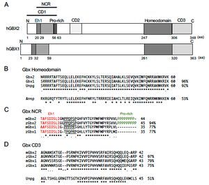 [[ファイル:Yamasu Gbx family Fig1.jpg|サムネイル|'''図1. Gbxタンパク質の構造と保存配列'''<br>'''A.''' Gbxタンパク質の構造の模式図。代表としてヒトGBX1とGBX2について、アミノ酸の位置を下に示す。CD1配列とNCR配列の範囲はGBX2についてのみ上に直線で示されている。<br>'''B.''' 脊椎動物のGbx2とGbx1、ショウジョウバエのUnpgとAntp各々のホメオドメインのアラインメント。<br>'''C.''' Gbx2とGbx1のNCR配列のアラインメント。典型的なPro-rich配列はGbx2のみだが、Pro-rich様配列(下線部)がGbx2とGbx1の両者で見られる。<br>'''D.''' Gbx2とGbx1のCD3配列のアラインメント。 h, m, z;各々ヒト、マウス、ゼブラフィッシュを示す。右に最上段の配列との一致度(%)を示す。ただし、NCRについてはGbx2で見られるN末側のPro-rich配列を考慮していない。]] | |||
