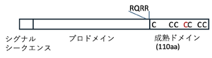 C末端側 (図右) に存在するシステイン残基は、システインノット構造の形成 (黒色) とダイマー形成 (褐色) に関与する。FurinやPACE4はRQRRを認識して切断し、C末端側が成熟ドメインとなる。