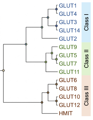 グルコーストランスポーターファミリーは主に3つのサブファミリー(クラスI、II、III)に分類され、14種類のメンバー(GLUT1-14/SLC2A1-14)で構成される[7]図3)。中枢神経系においてはGLUT1が主に脳毛細血管に発現し、GLUT3が主に神経細胞に発現している。また、インスリン応答性であるGLUT4も特定の神経細胞での発現が報告されている。GLUT2は視床下部弓状核や孤束核などの特定領域の細胞に発現している。GLUT1、GLUT2、GLUT3、GLUT4はクラスIに属している。