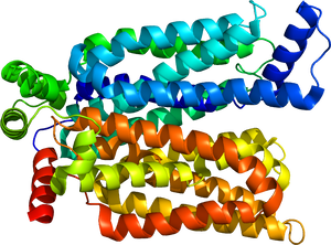 グルコーストランスポーターは、細胞膜を貫通する膜輸送タンパク質であり、12本の膜貫通αヘリックスから構成されている。これらの膜貫通領域はN末端側とC末端側にそれぞれ6本ずつ配置され、両末端は細胞質側に存在する(図1, 2)。膜貫通領域によって形成される中央の空間がグルコース結合部位および輸送経路として機能し、細胞外側と細胞内側のいずれか一方に開いた状態をとることでグルコースを輸送する[4][5]。GLUT1には糖鎖付加型である55kDa型と非糖鎖付加型である45kDa型が存在する[6]