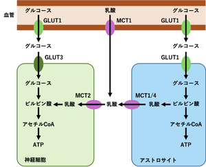 脳内のエネルギー供給については、アストロサイト‐ニューロン乳酸シャトル(ANLS)仮説が提唱されている[16](図3)。血液脳関門のGLUT1により血液から脳へグルコースが供給される。その後、グルコースはアストロサイトに取り込まれ乳酸へ代謝され、その乳酸が神経細胞に供給される。また、血液脳関門のGLUT1により供給されたグルコースの一部はGLUT3により神経細胞に直接取り込まれる[17]図4)。GLUT3によるグルコースの直接供給は神経細胞の基礎代謝を維持し、ANLSによるエネルギー供給は急激なエネルギー需要増大への対応や局所的な代謝の安定化を担っていると考えられている。